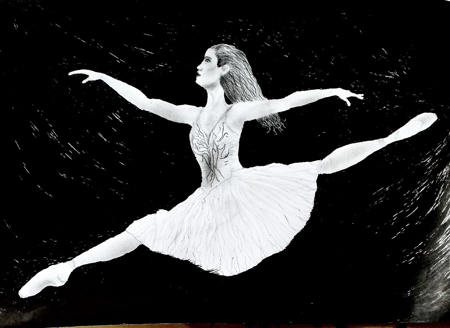 „Baletnica w locie”; tech.: ołówek + tusz -