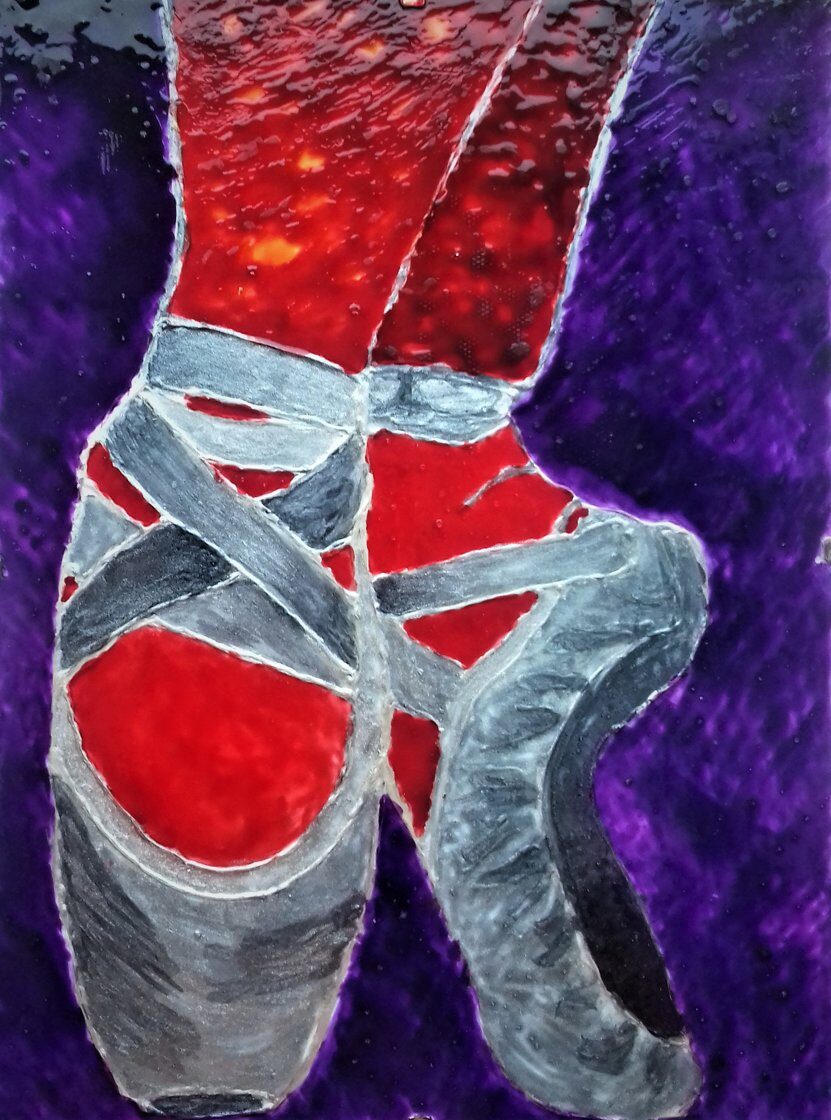 "Pointe Shoes"; tech. konturówka + farby do szkła Komentarz: Pierwszy witraż -